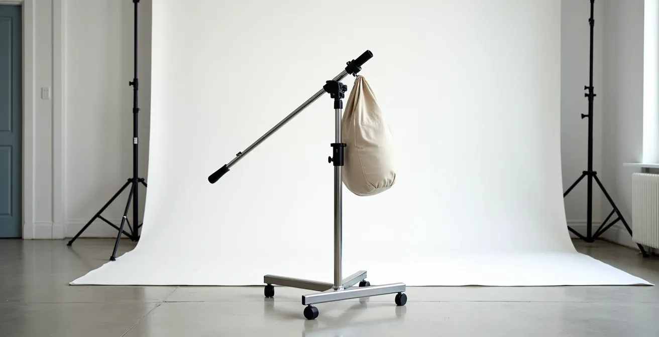 Dieser Leitfaden wird Ihnen nicht einfach sagen, „benutzen Sie Sandsäcke“. Er wird Ihnen erklären, warum ein falsch platzierter Sandsack gefährlicher sein kann als gar keiner. Er wird die Mechanik hinter einem perfekt ausbalancierten Galgenarm aufschlüsseln und Ihnen die Set-Protokolle vermitteln, die den Unterschied zwischen einem reibungslosen Shooting und einer 5.000-€-Katastrophe ausmachen. Es geht darum, die Kontrolle zu übernehmen und das „Hoffentlich hält es“ durch ein „Ich weiss, dass es hält“ zu ersetzen.